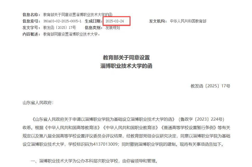 2025年2月,淄博职业学院正式升格为淄博职业技术大学(教育部批文时间为2月24日)。由于该升格批文下发时间晚于山东省2025年专升本招生计划发布时间(2月6日),淄博职业技术大学未能参与到2025年专升本招生。但其2026年是否参与招生,具体的相关动态还需以官方后续通知为准。