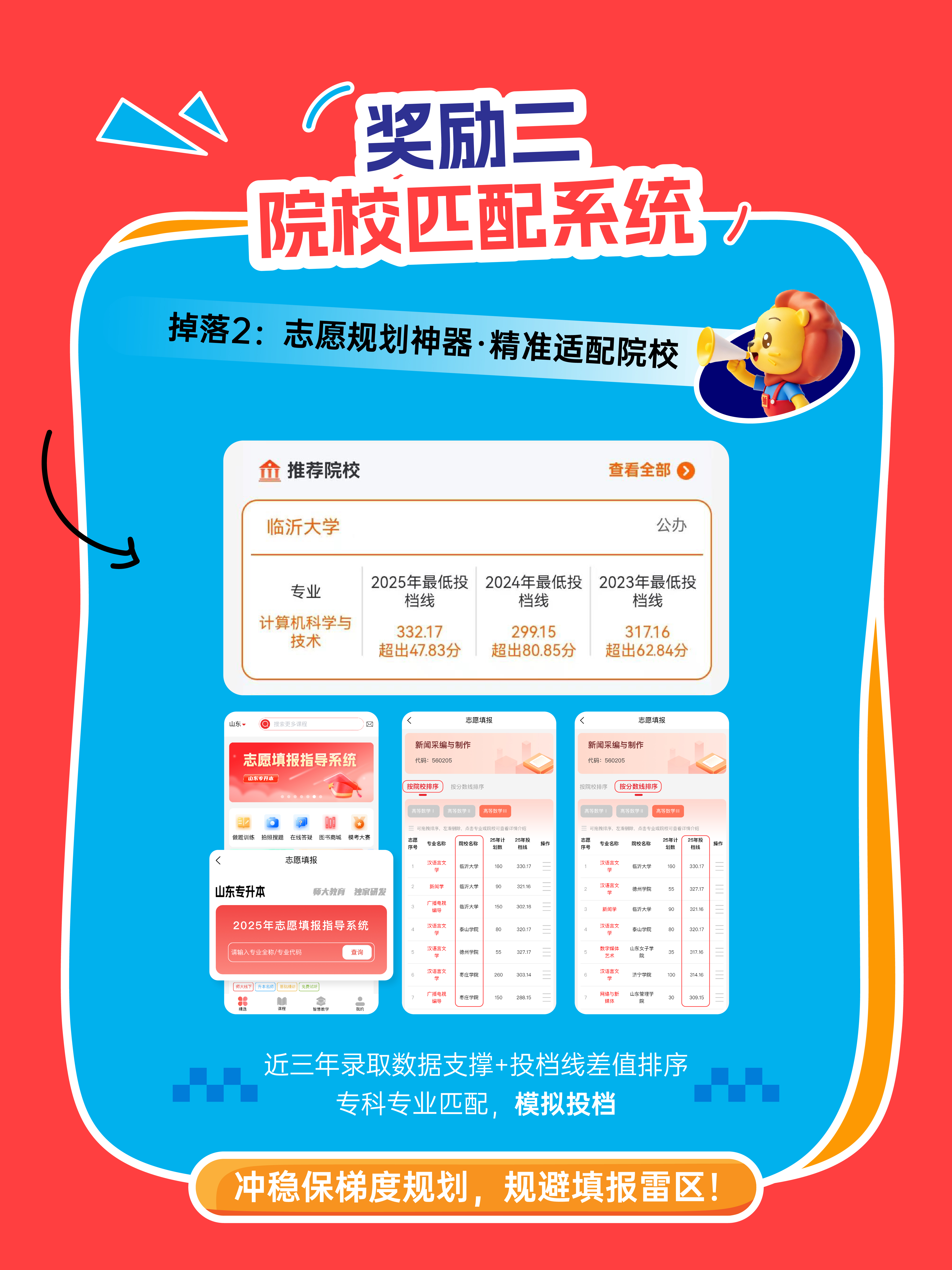 智能院校推荐基于你的总分与专科专业,联动近三年录取数据,按投档线差值排序推荐,明确标注分数适配情况,助力规划“冲、稳、保”志愿梯度。APP还内置志愿填报系统,提前演练填报流程,规避填报雷区,让每一分努力都转化为上岸底气。