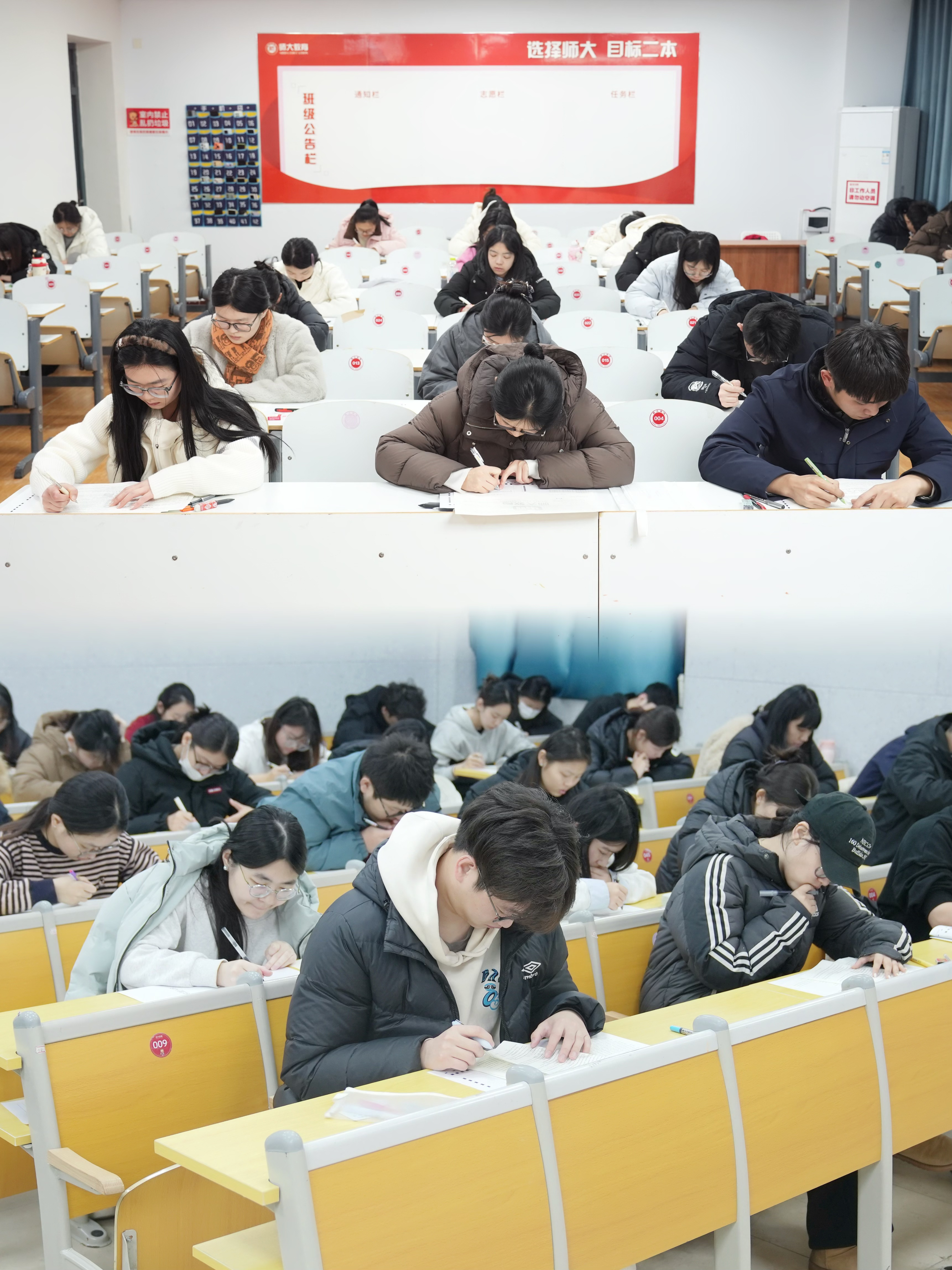 同学们眉目专注、下笔笃定。曾经反复背诵的知识点、演练过数遍的题型、整理归纳的解题思路,在此刻化为笔下行云流水的答案。一张张认真答卷的侧脸,是深冬里最坚定的风景,此刻正是升本人奔赴梦想的关键“猎杀时刻”!