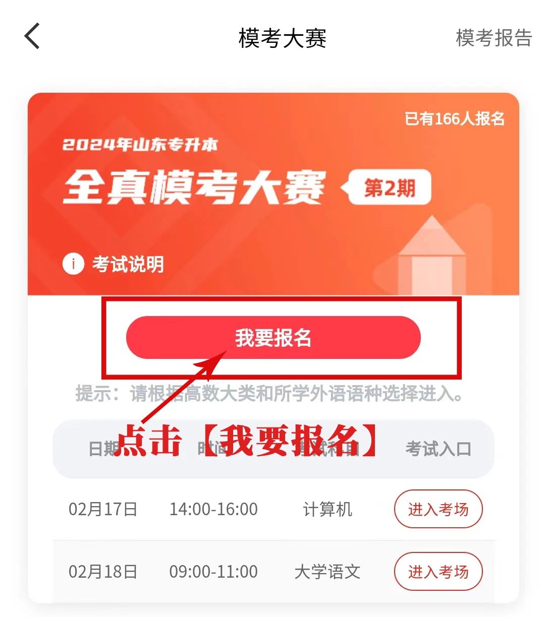 在全真模考大赛第二期中,点击【我要报名】。
