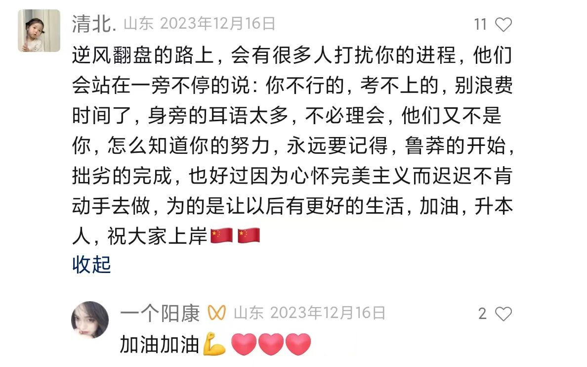我很喜欢看评论区的你们,因为这时的你们褪去了各自的标签,隐藏在一个个网络ID之下,可以尽情的将自己的想法一一道来。在这些获取诸多点赞的评论中,我发现,有梗,有调侃,有快乐,也有温暖和治愈,创造这些的,正是每一个鲜活可爱的最真实的升本人,在这里,你们不再是升本人的代号,而是一个个独立自由的灵魂。