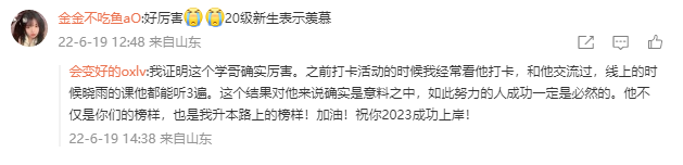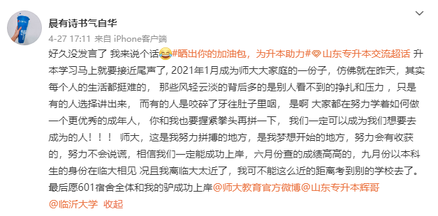 如今我已经成功上岸临沂大学,我想送给20、21级学弟学妹们一些心里话,我很喜欢晓玲老师上课说的一句话『宁鸣而死,不默而生』。每个人都有自己的梦想,带着对未来的美好憧憬,我们既然选择专升本,目标就是最高分。