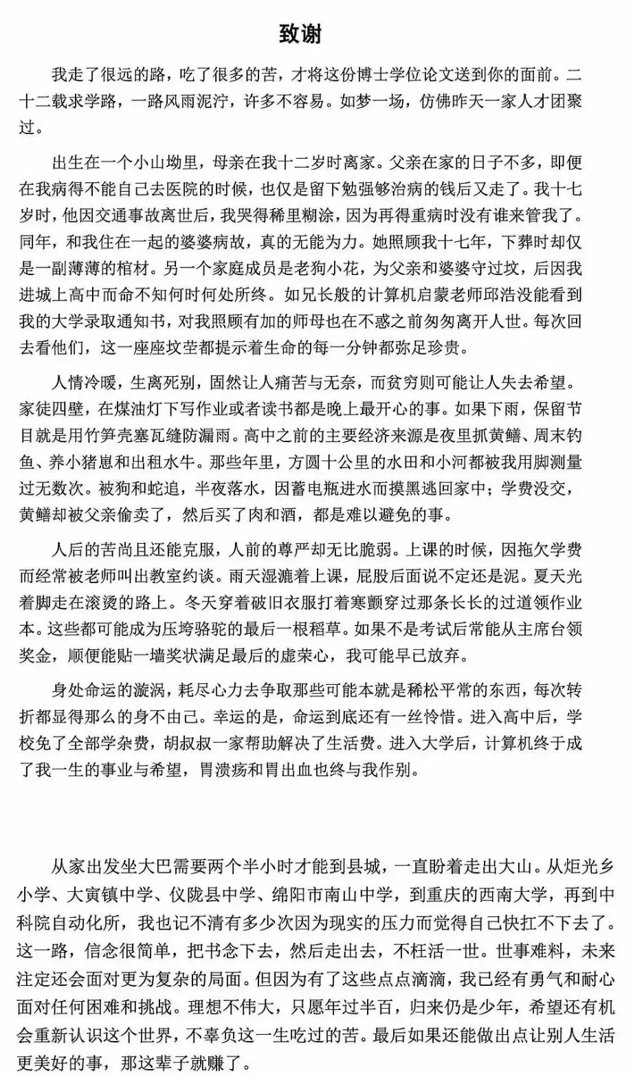 近日,中国科学院自动化所一博士论文的致谢部分在网上引发热议。作者黄国平在《致谢》中回顾自己如何一路走出小山坳、和命运抗争的故事,在多个网络平台走红。