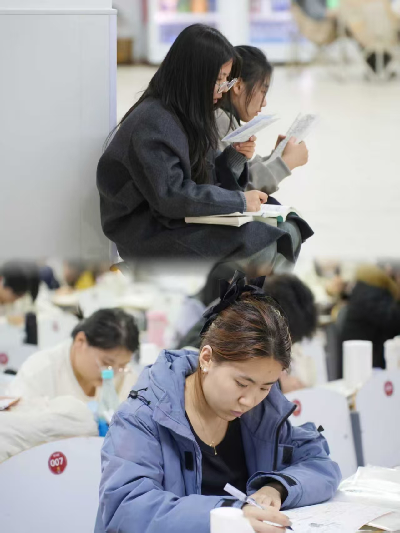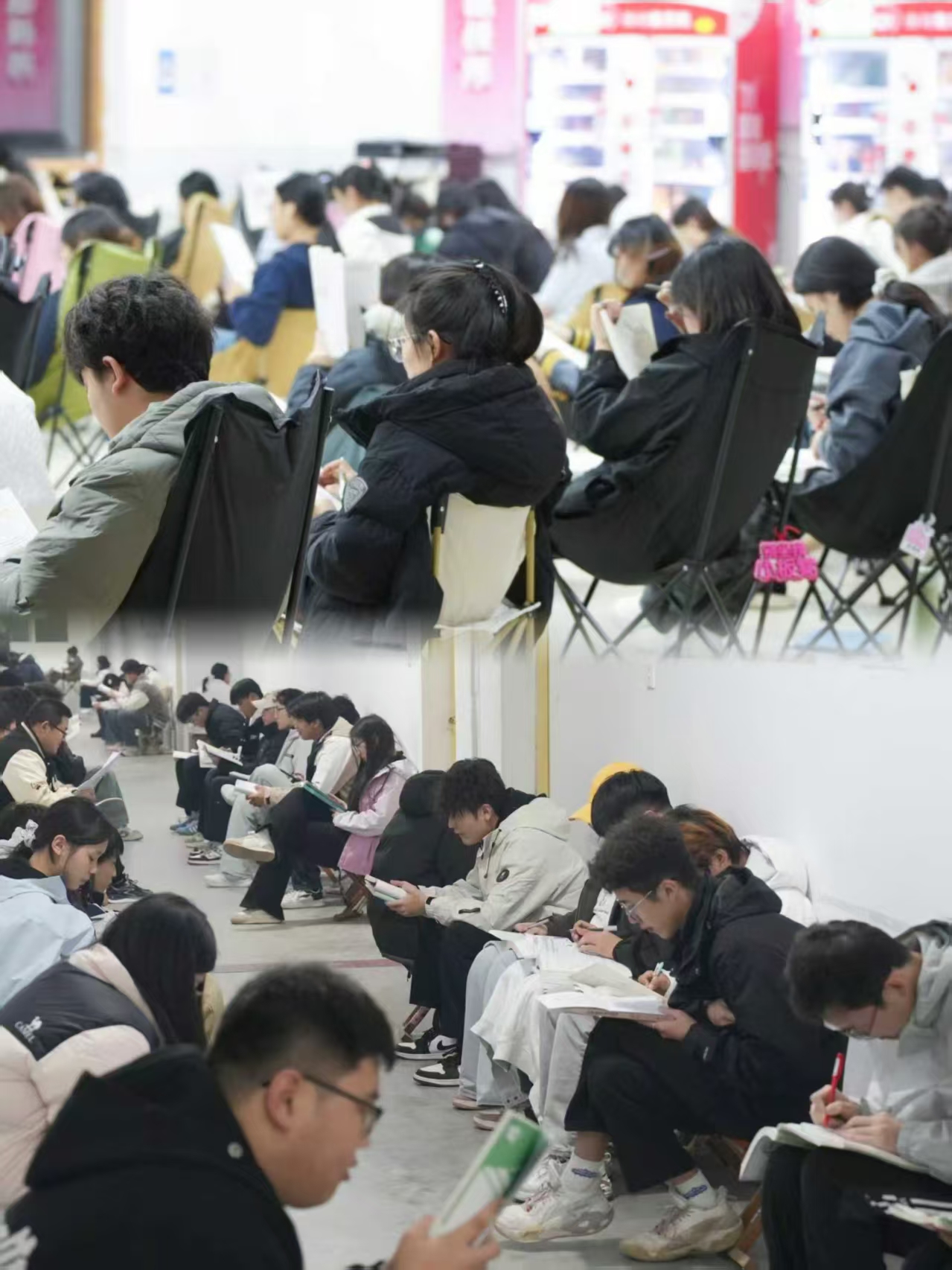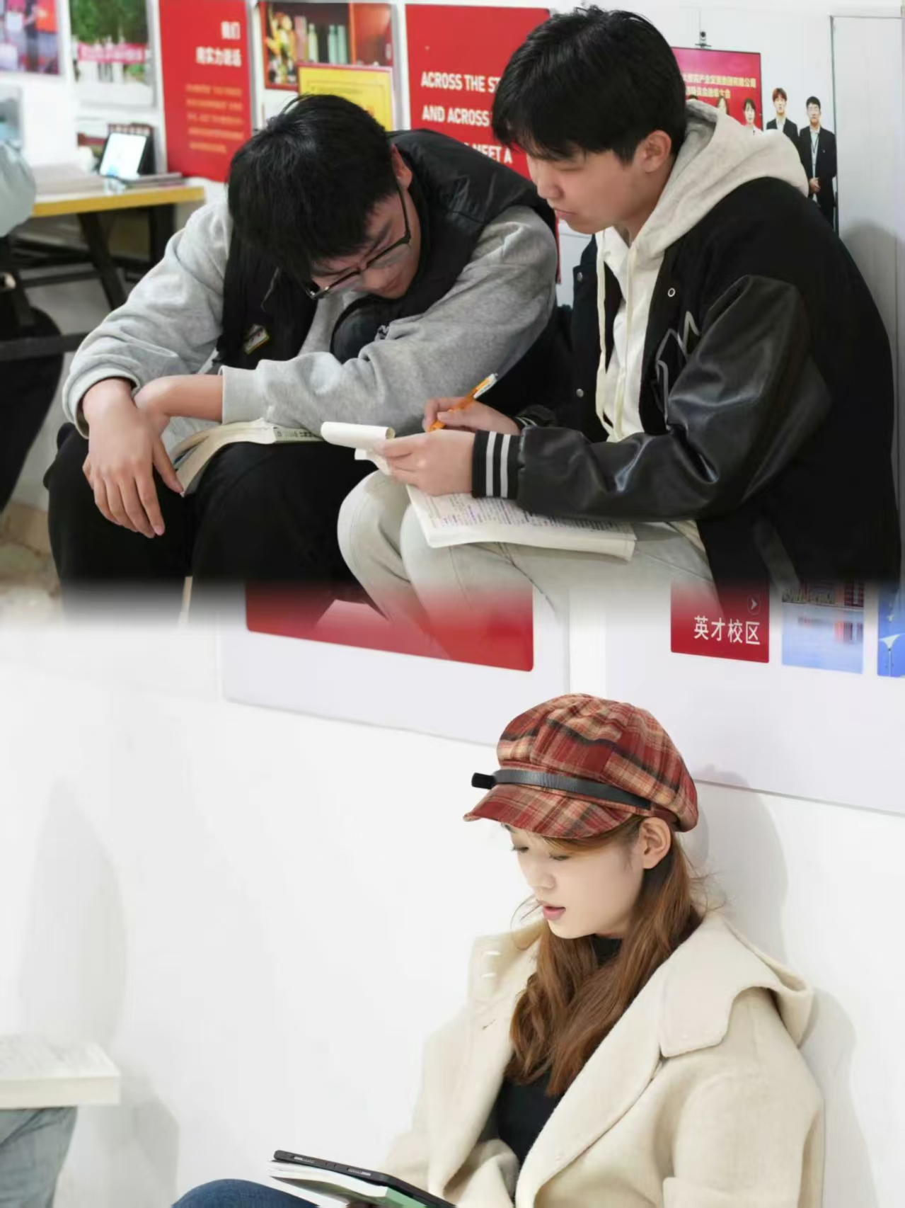 曾经只有零星几人的空旷之处,如今每一处都被求知的身影填满。走廊上、教室外,随处可见同学们或站或坐,以各自最投入的姿态,紧握着手中的复习资料。