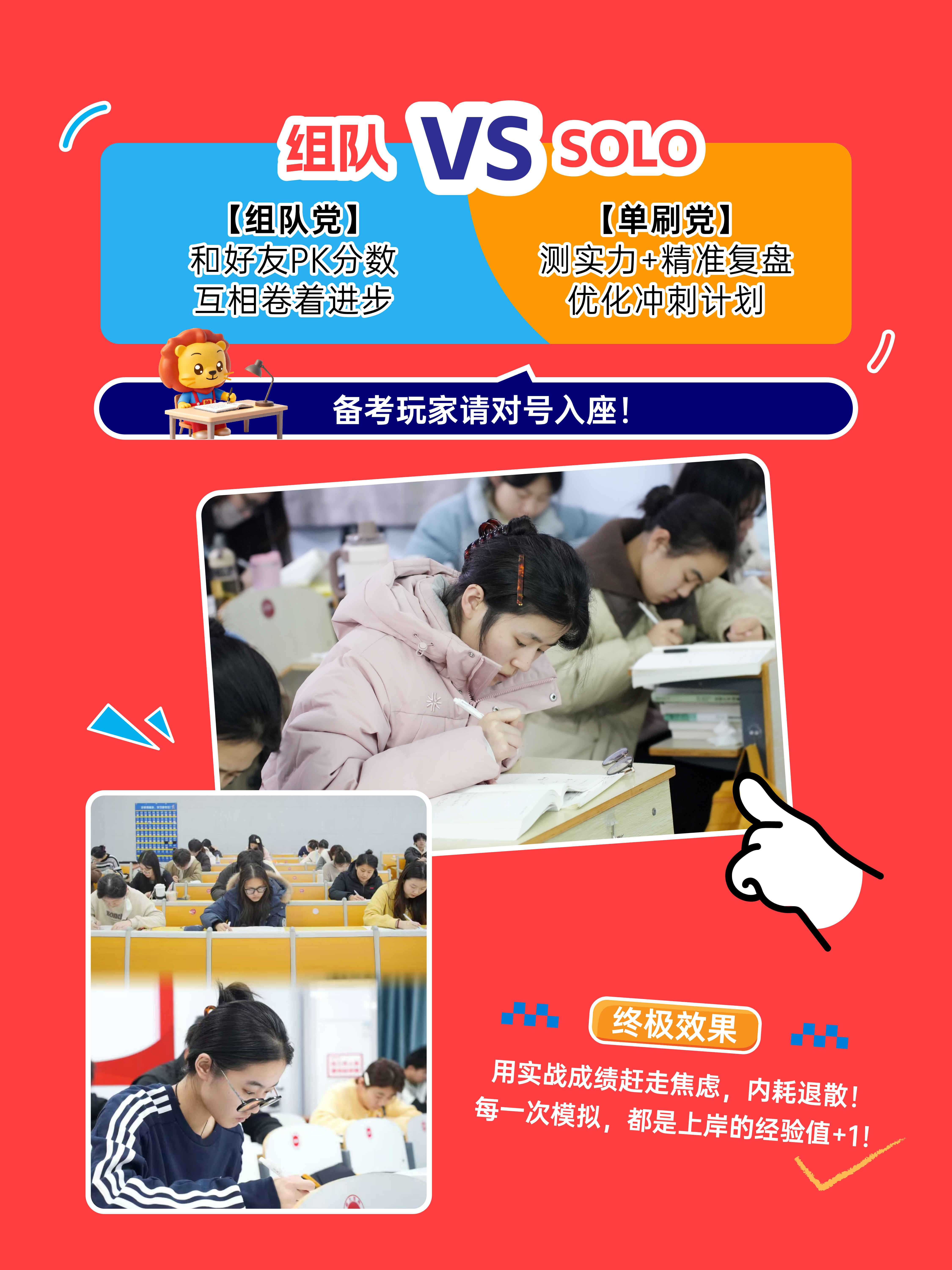备考方式不同,成长路径相同。喜欢独自钻研?这场模考能精准测出你的真实水平,帮你优化冲刺计划。喜欢团体作战?拉上同学一起报名,互相监督、PK进步,卷出新高。无论哪种方式,目标都是一样,用实战成绩消除焦虑,让每一次模拟都成为上岸的经验值+1。