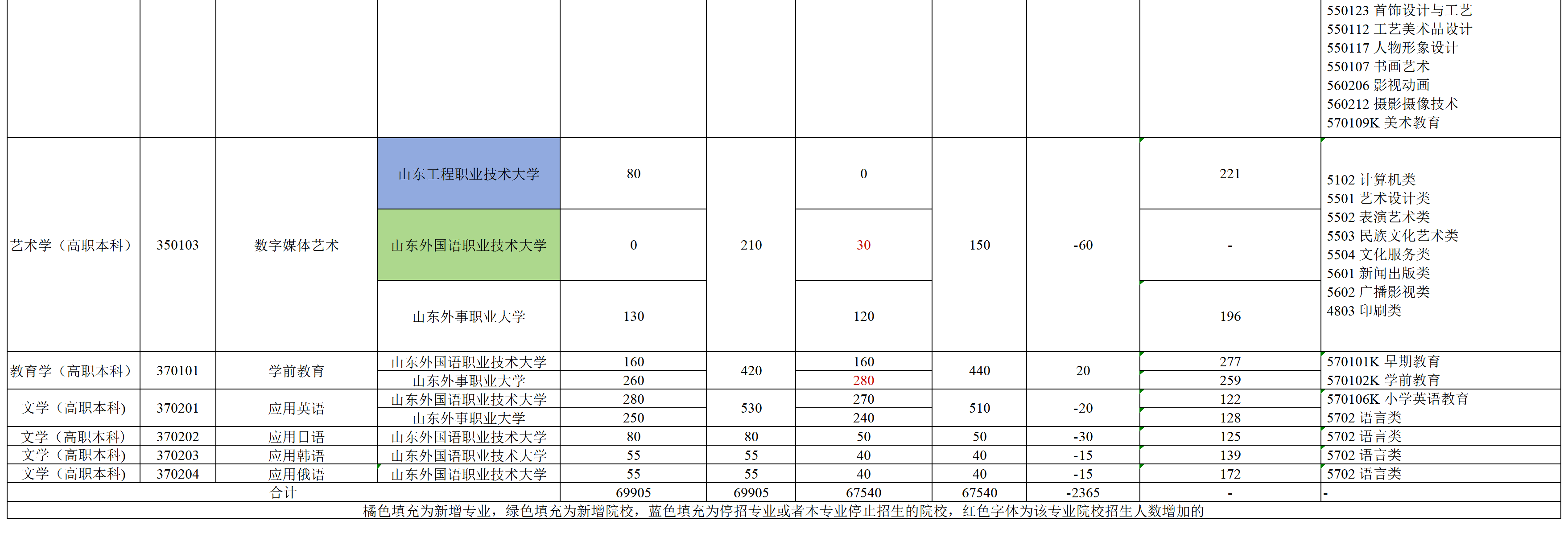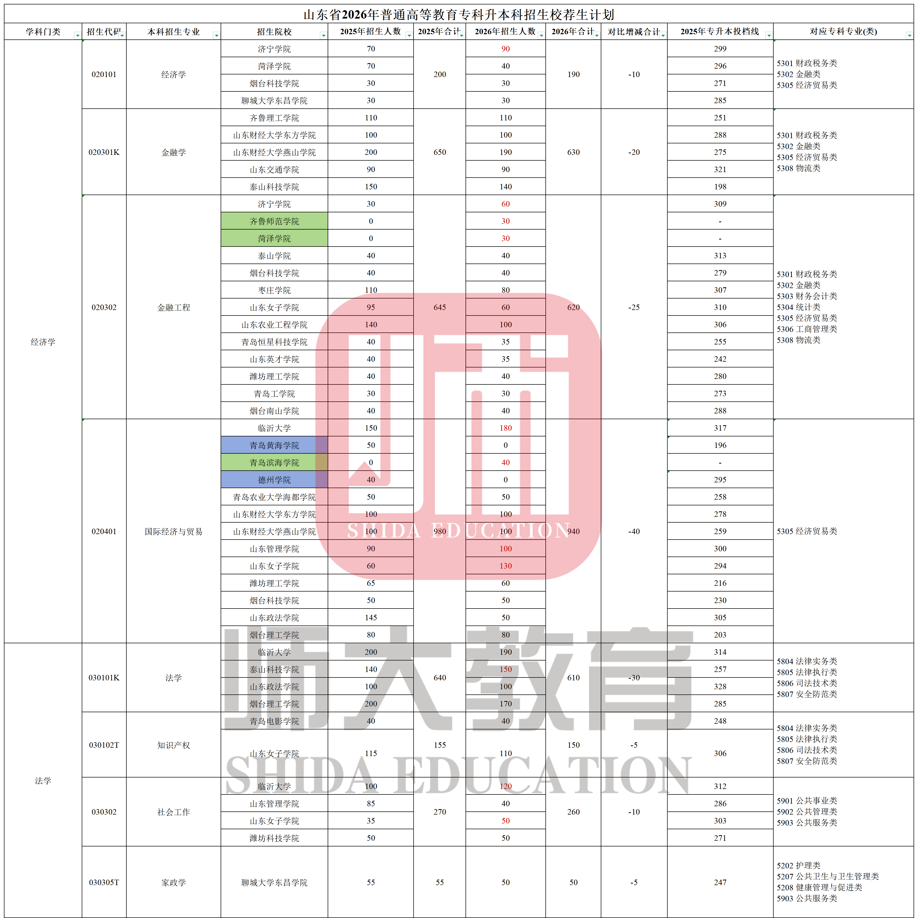 以下表格为2026年普通高等教育专科升本科招生计划对比!绿色填充为本专业新增招生院校;蓝色填充为停招专业或者本专业停止招生的院校;红色字体为该专业院校招生人数增加。