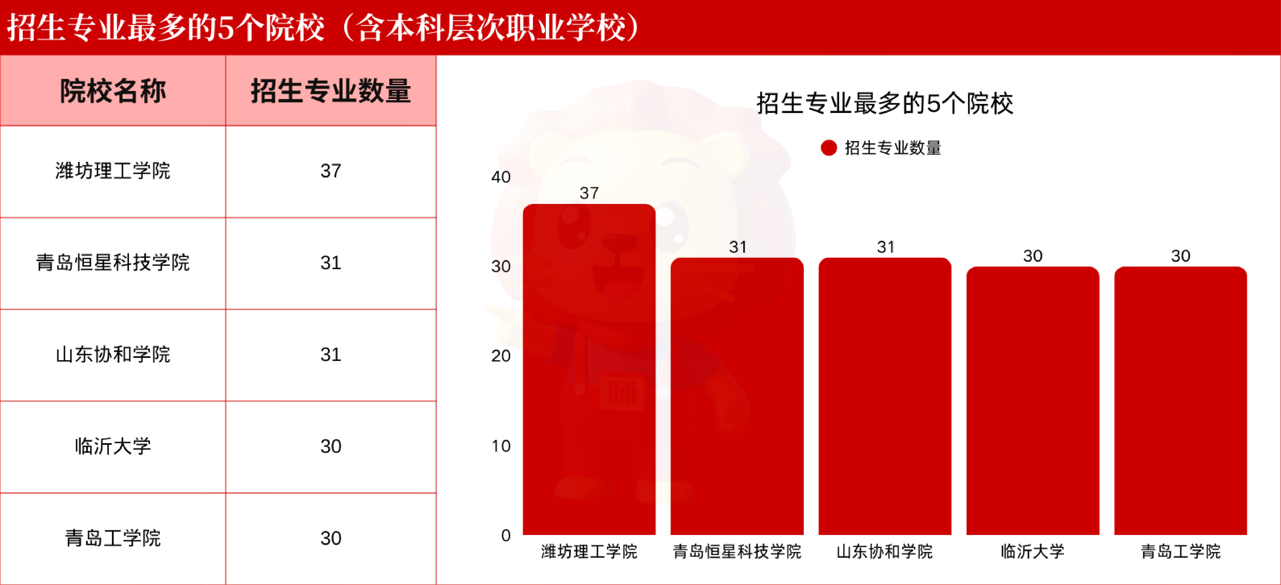 潍坊理工学院37个专业;青岛恒星科技学院31个专业;山东协和学院31个专业;临沂大学30个专业;青岛工学院30个专业。