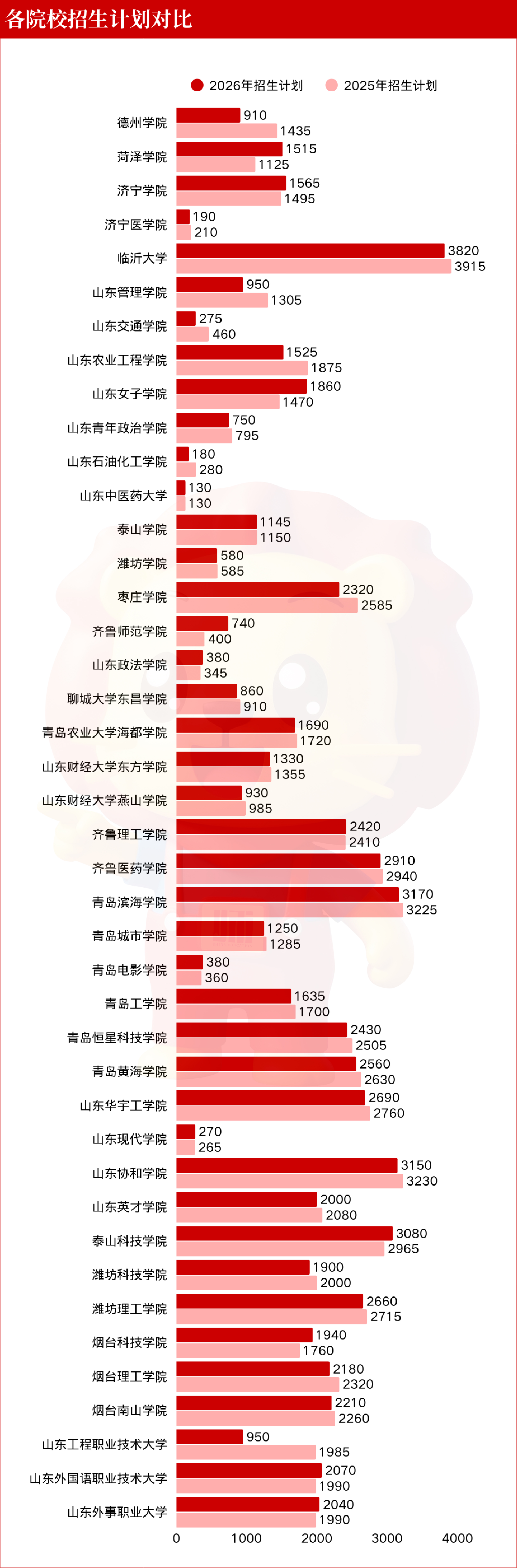 临沂大学3820人;青岛滨海学院3170人;山东协和学院3150人;泰山科技学院3080人;齐鲁医药学院2910人。