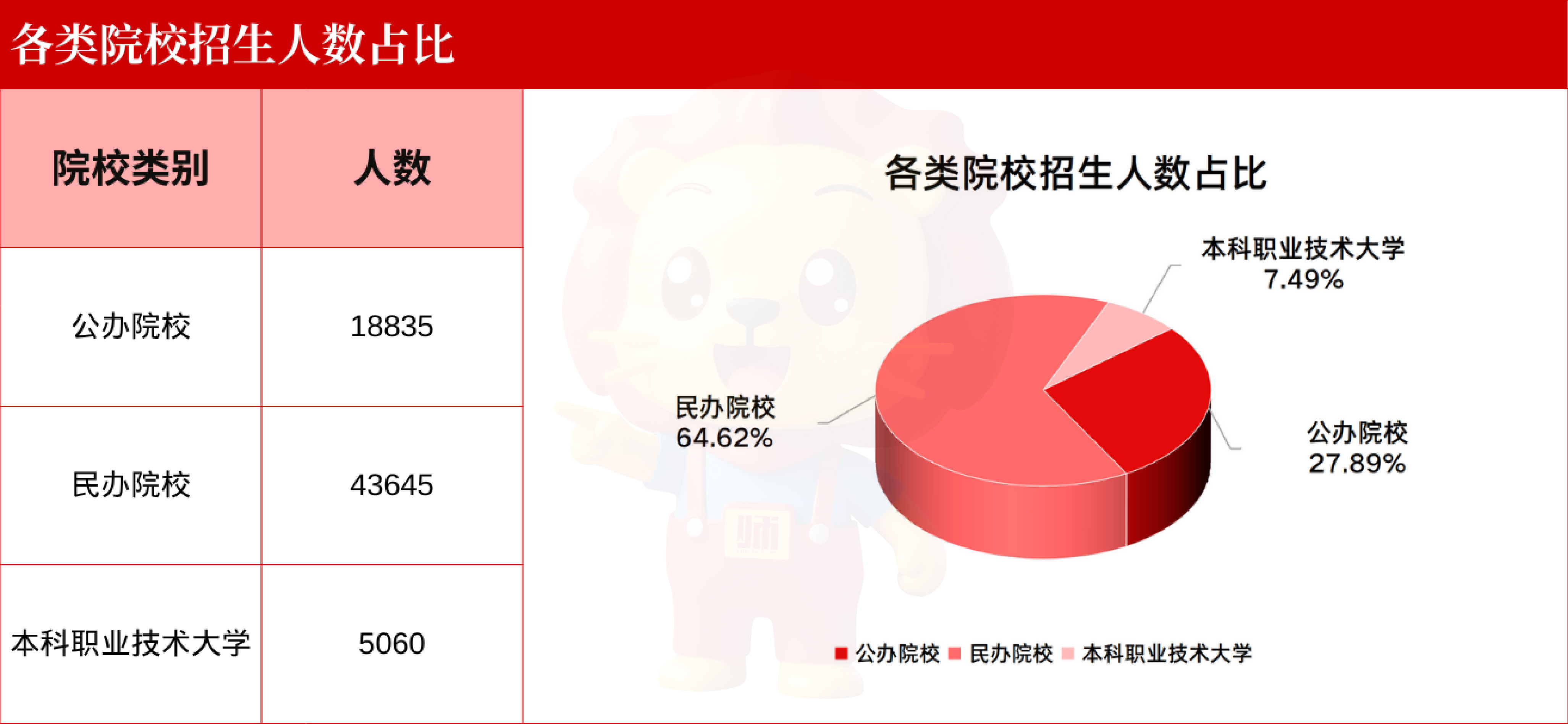 公办院校招生18835人,相较于2025年减少725人,占比27.89%;民办院校招生43645人,相较于2025年减少735人,占比64.62%,高职本科招生5060人,相较于2025年减少905人,占比7.49%。