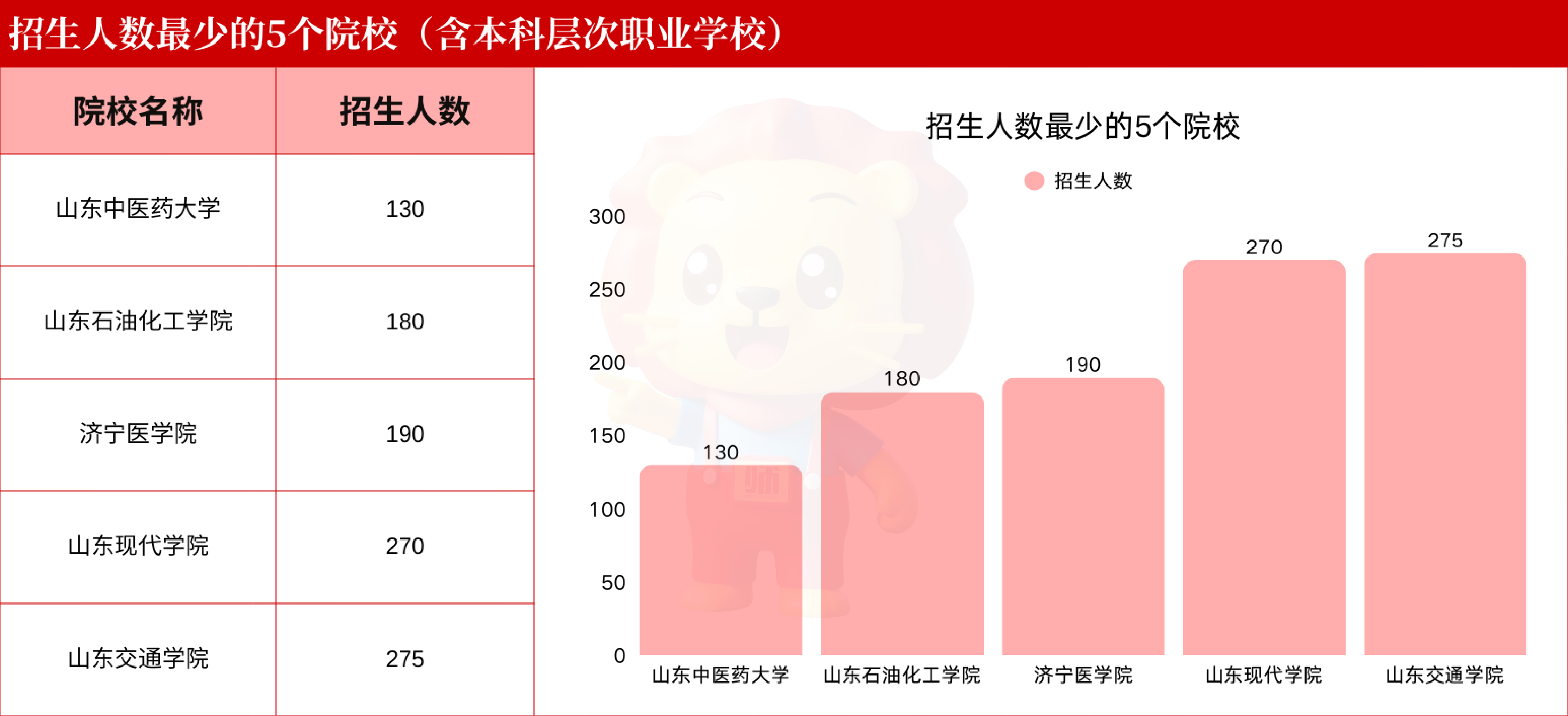 山东中医药大学130人;山东石油化工学院180人;济宁医学院190人;山东现代学院270人;山东交通学院275人。