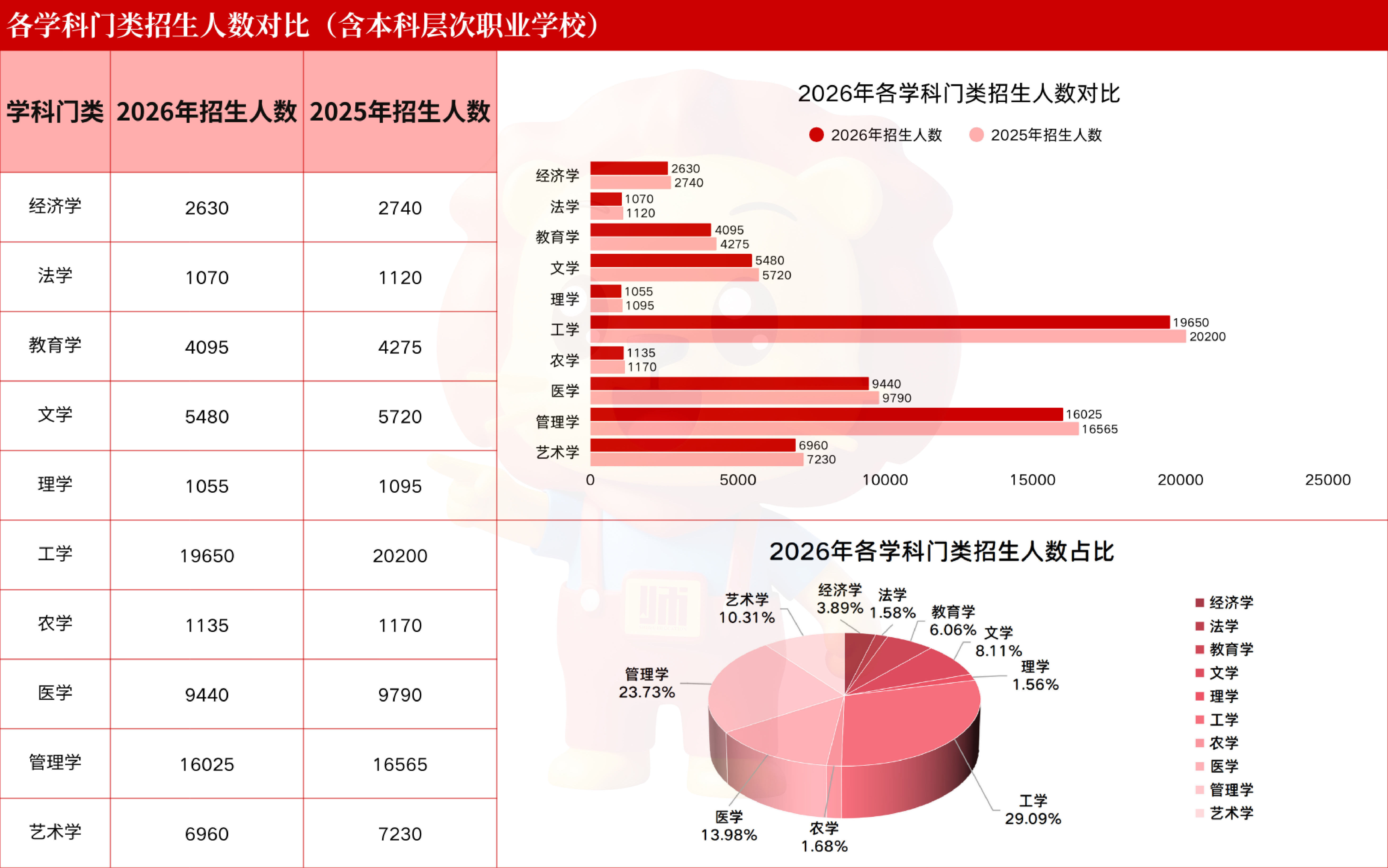下图为山东专升本2026年与2025年各学科门类招生人数对比、招生人数占比(依据四舍五入保留):