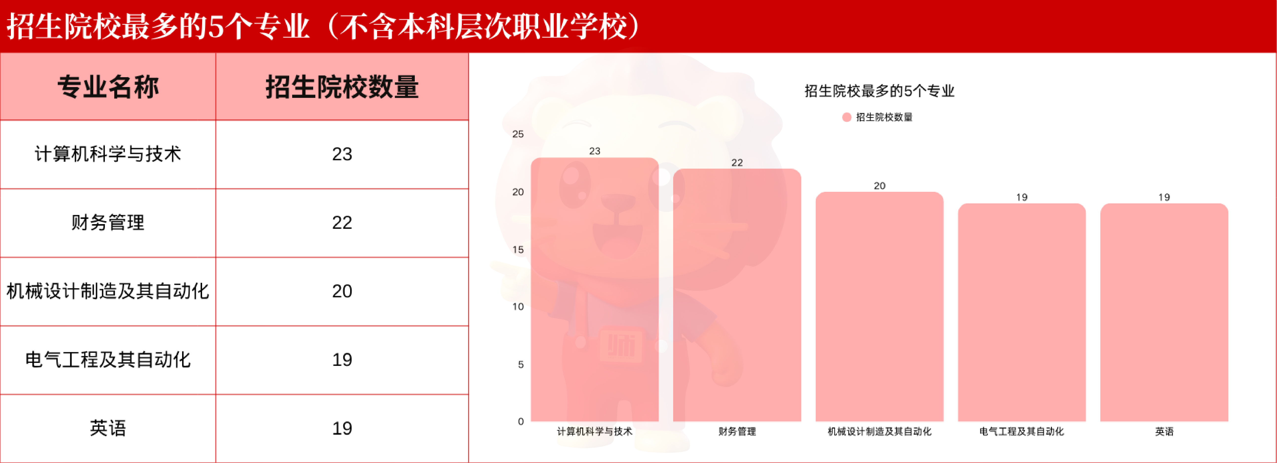计算机科学与技术23所;财务管理22所;机械设计制造及其自动化20所;电气工程及其自动化19所;英语19所。