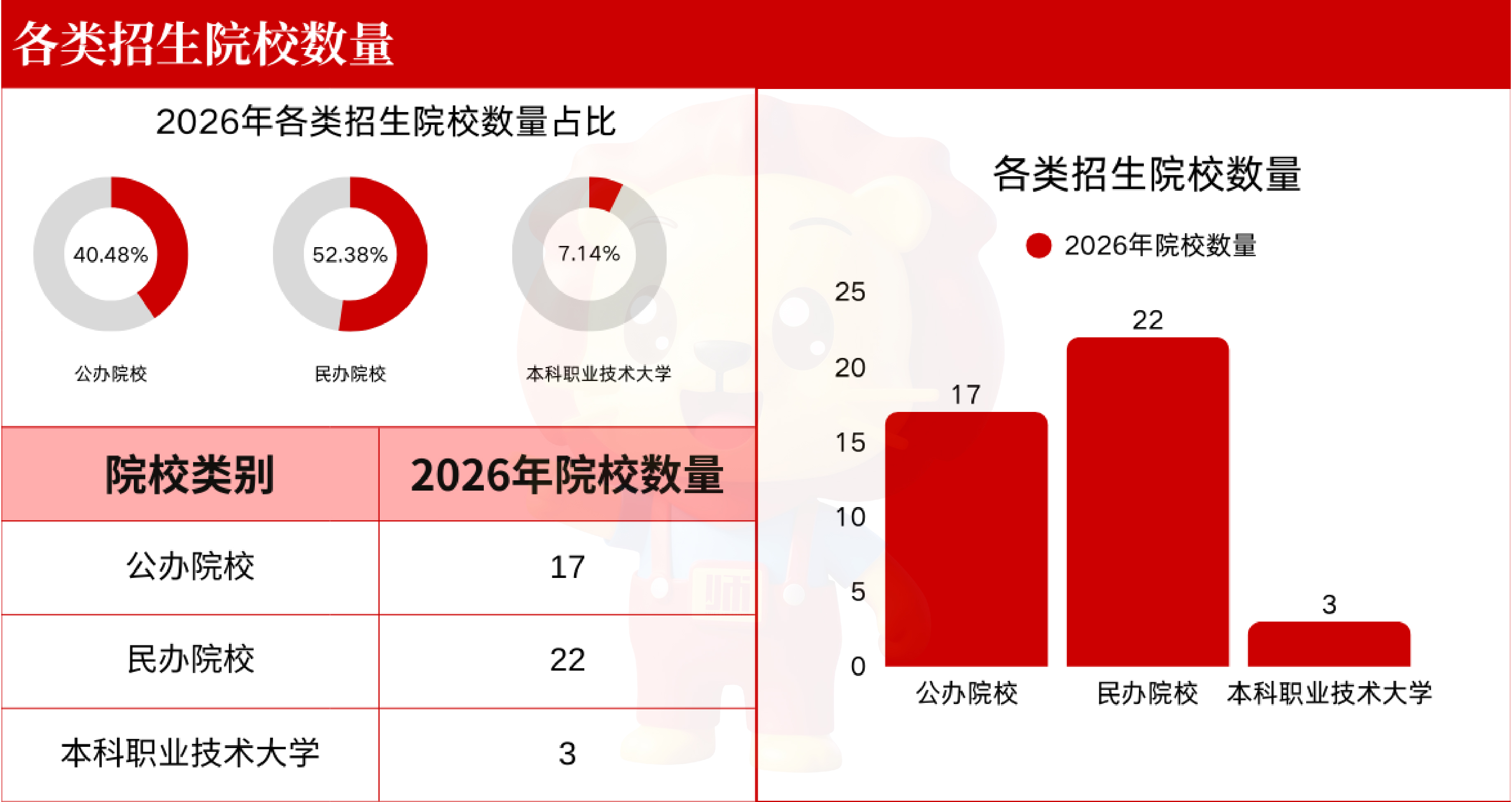 其中公办院校17所,占比40.48%;民办院校22所,占比52.38%,高职本科招生3所,占比7.14%。