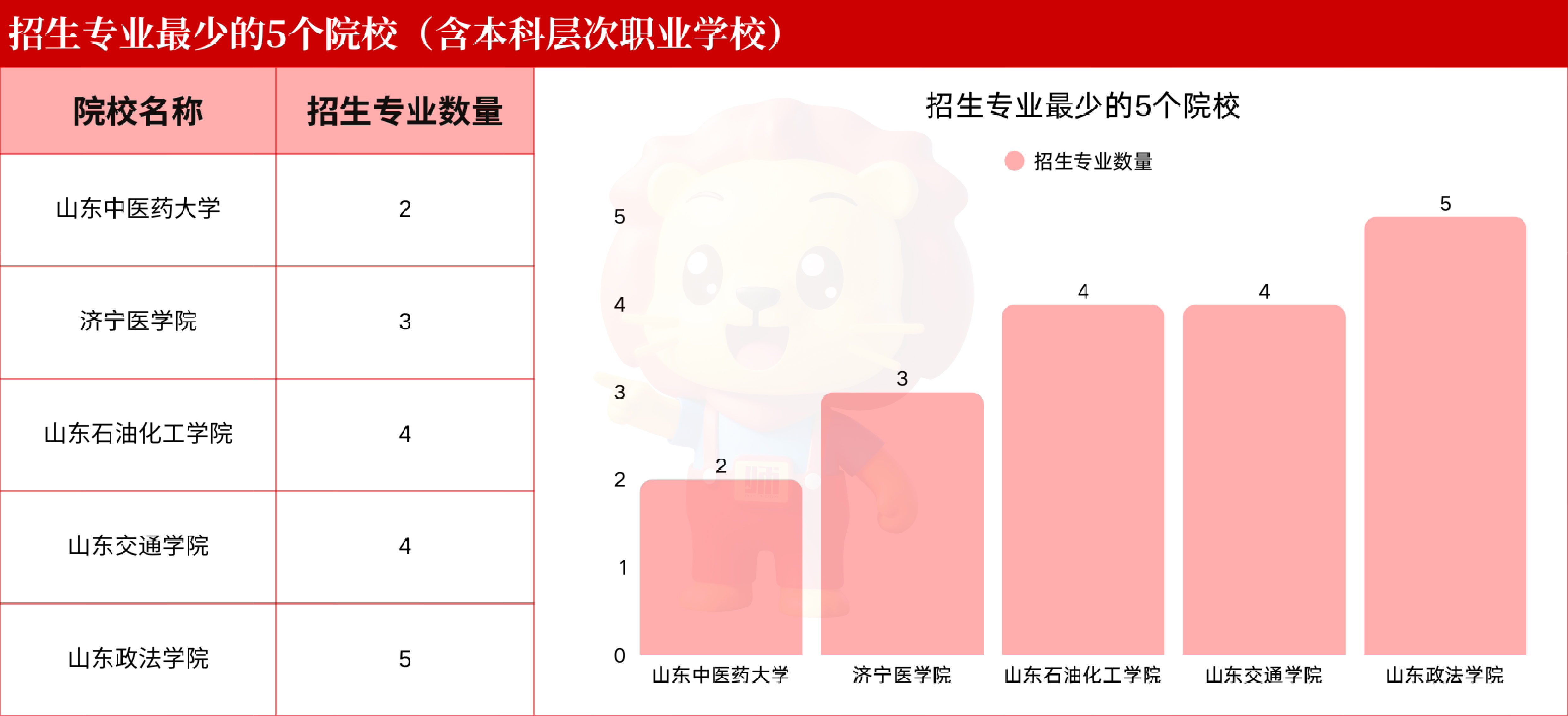 山东中医药大学2个专业;济宁医学院3个专业;山东石油化工学院4个专业;山东交通学院4个专业;山东政法学院5个专业。