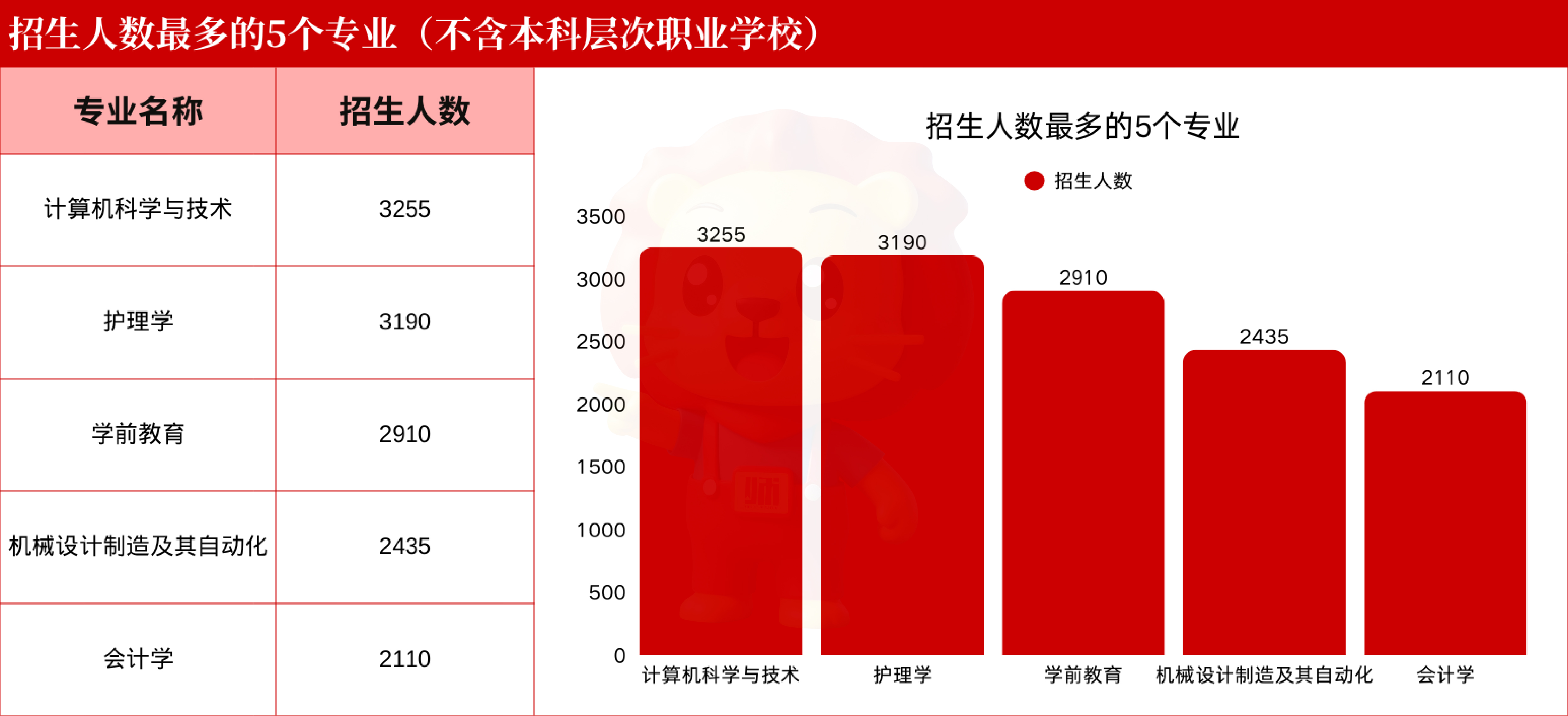 计算机科学与技术3255人;护理学3190人;学前教育2910人;机械设计制造及其自动化2435人;会计学2110人。